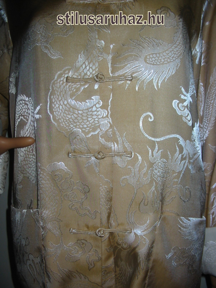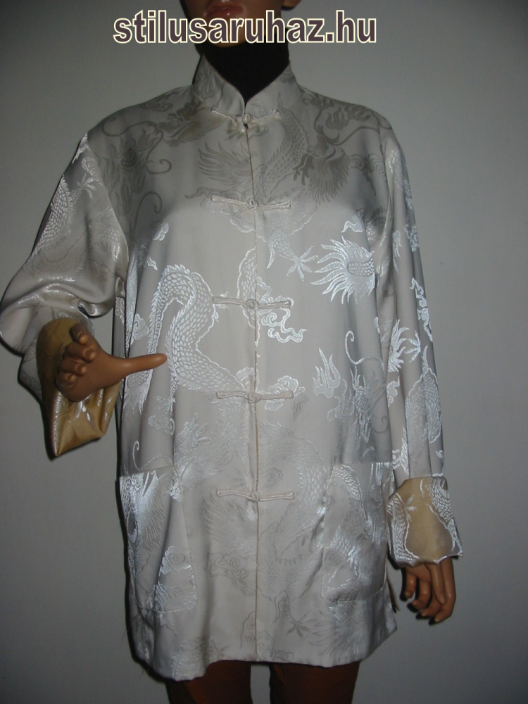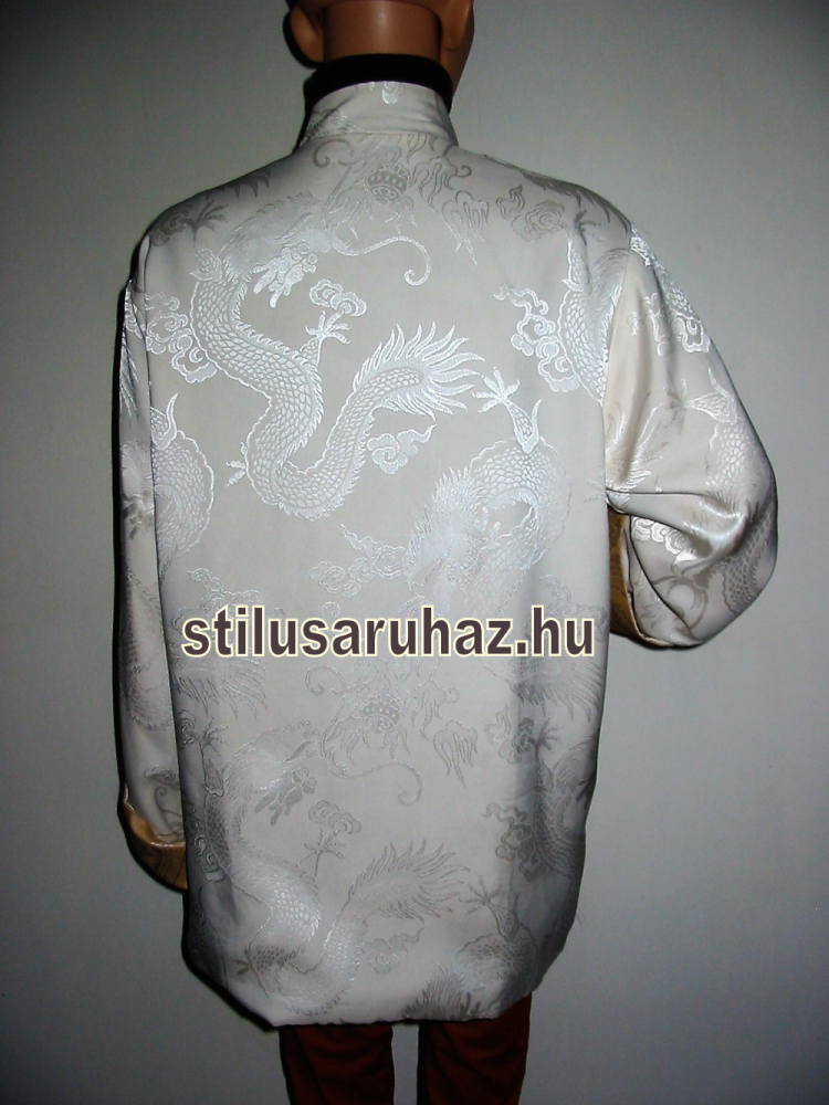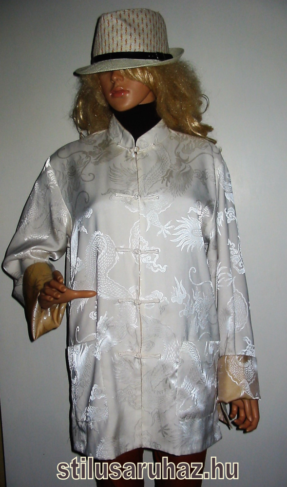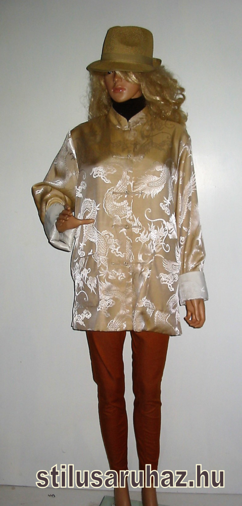 Pasztell színvilága, szép fényes selymes tapintású anyaga és egyedi mintázata teszi szemet vonzóvá ezt az állónyakú, elöl két benyúlós zsebbel készült egyenes vonalú, hosszított blézert. A saját anyagából készült érdekes gombok és mutatós zsinóros gomboláspántok tovább fokozzák ezt a hatást.