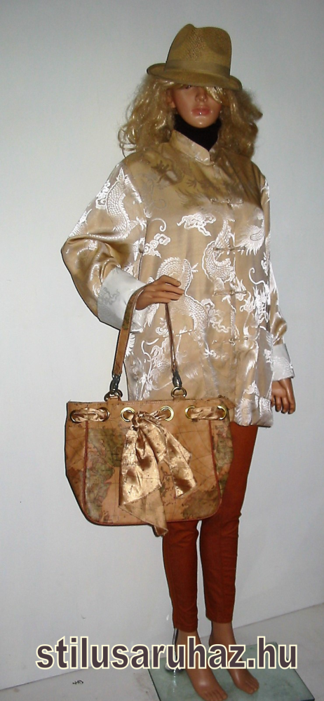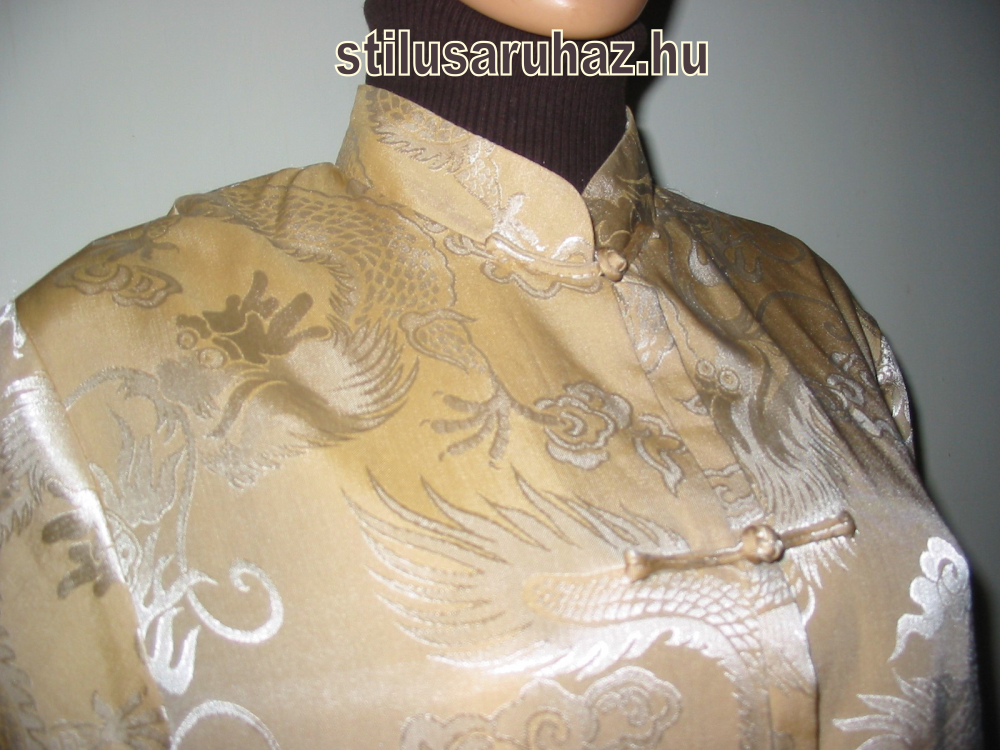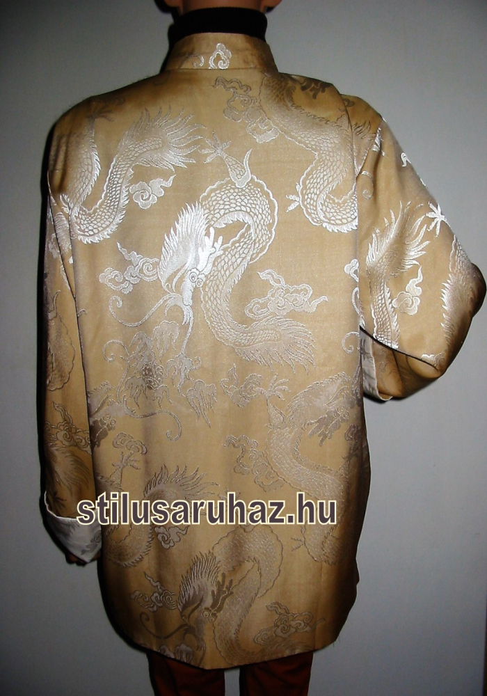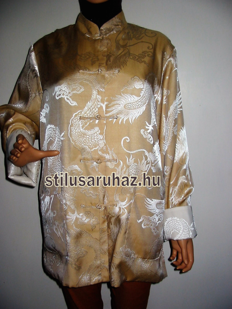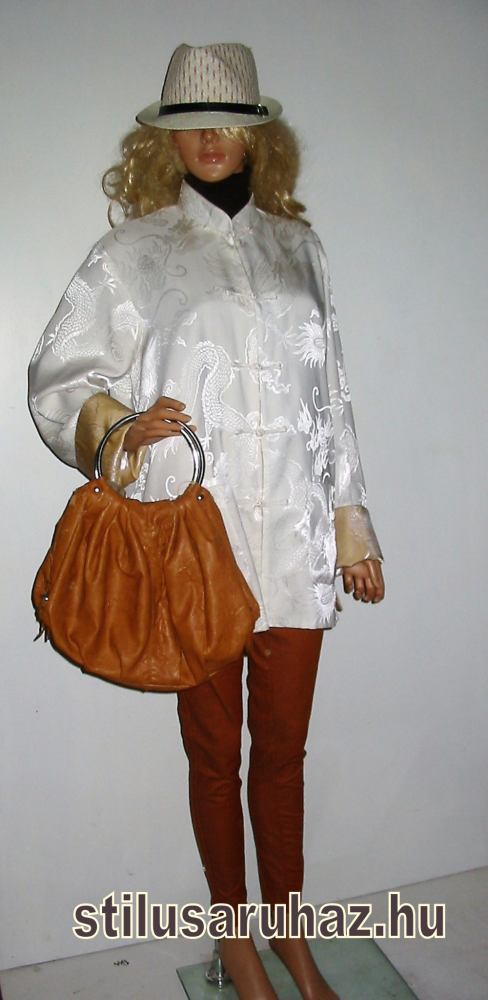Pasztell színvilága, szép fényes selymes tapintású anyaga és egyedi mintázata teszi szemet vonzóvá ezt az állónyakú, elöl két benyúlós zsebbel készült egyenes vonalú, hosszított blézert. A saját anyagából készült érdekes gombok és mutatós zsinóros gomboláspántok tovább fokozzák ezt a hatást.