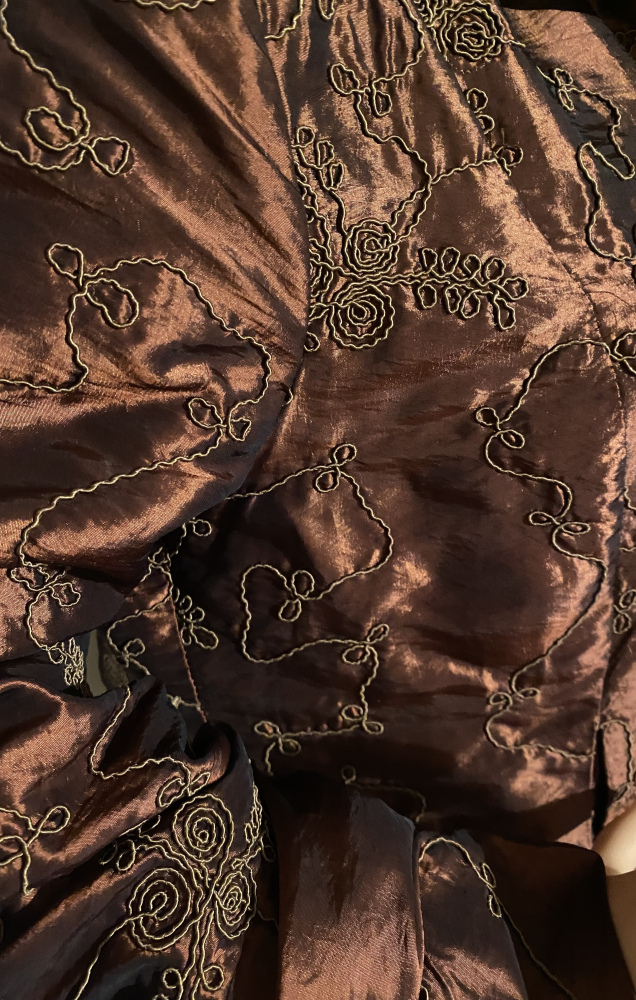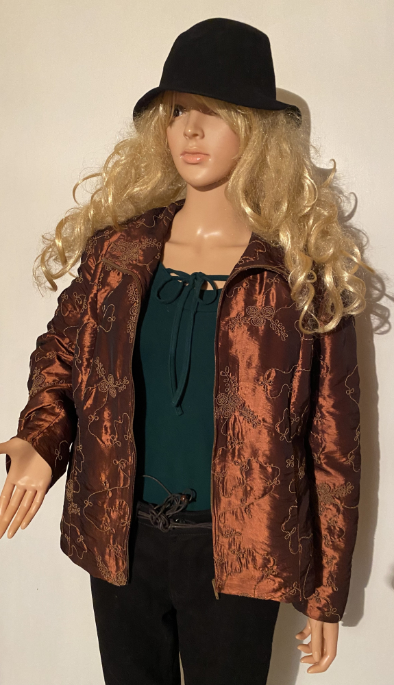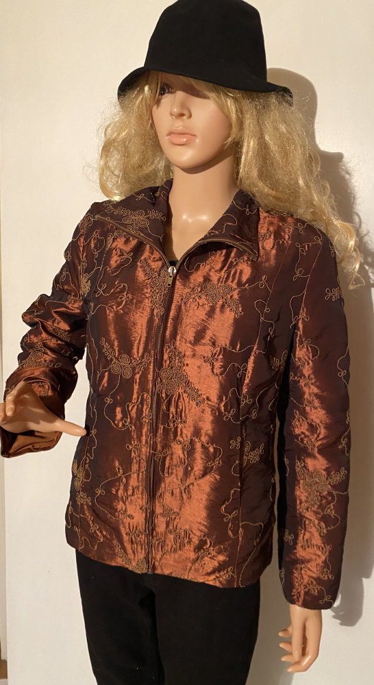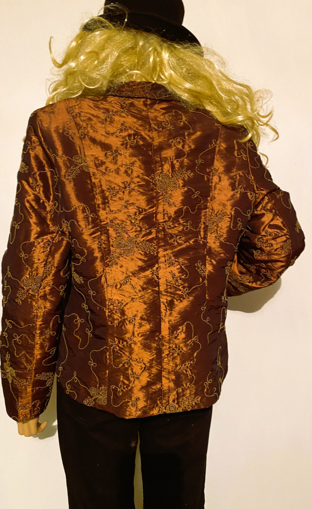 Egyenes szabású rövid átmeneti kabátka, aranybarna alapon, finom, részletgazdag, azonos színű mintával. Kissé fényes anyagú, így elegánsabb alkalmakra is tökéletes. Több helyen szabott, finoman hangsúlyozza az alakot. Könnyű, elegáns darab, akár a blézert is helyettesítheti!