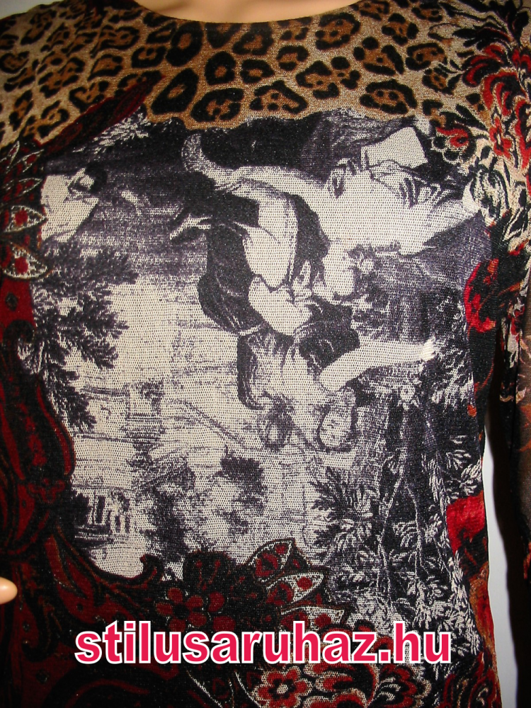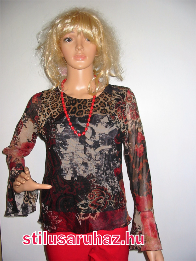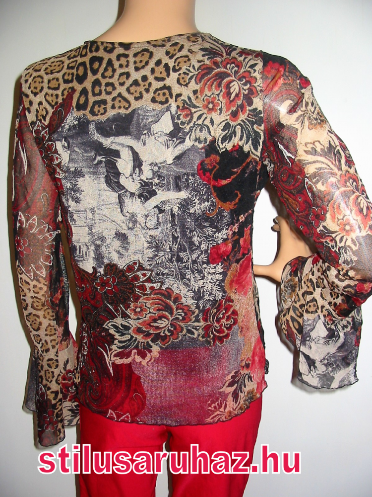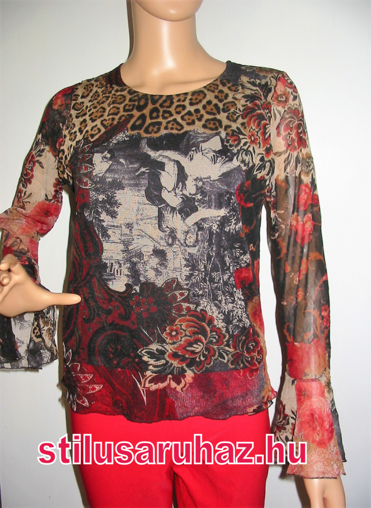 A színes hosszú ujjú felső mutatós pillekönnyű anyaga, szép mintázata, érdekes színvilága különleges hangulatot kölcsönöz viselőjének.