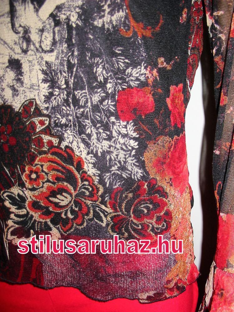 Színek és minták kellemes kavalkádja ez a francia, gobelein hatású mintákkal készült színes hosszú ujjú felső. Az elöl, hátul bélelt felső könnyed eleganciáját a béleletlen ujjak adják, amelyek tölcsérujjként omlanak a csuklókra. Akár a felső színeivel harmonizáló nadrággal vagy szoknyával párosítod, az összhatás mindig tökéletes eleganciát sugall.